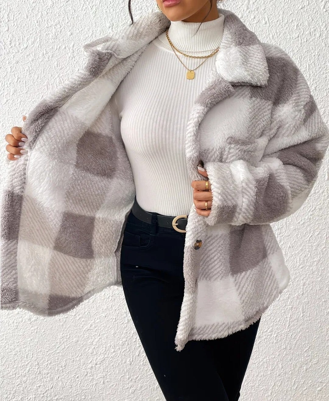 Plus Size - Damska kurtka z Polaru w kratę z długim rękawem Plus Size, codzienna odzież wierzchnia na jesień i zimę, ciepła i stylowa.